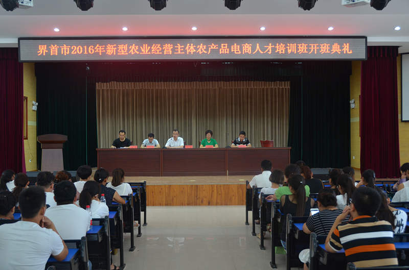 7月27日,界首市2016年新型农业经营主体农产品电商人才培训班在阜阳科技工程学校实训楼五楼报告厅隆重开班。界首市农委农科教股股长年丽婷、农科教股副股长郭文华、阜阳科技工程学校校长闫锋、培训处主任段刚、 省电子商务讲师团专家安徽科技学院副教授张宝国等共同出席开班仪式。来自全市种养大户、家庭农场、农民合作社、复员军人、返乡农民工等110名培训人员参加了开班典礼。