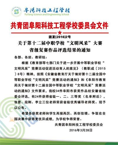 第十二届全国中职学校文明风采大赛安徽省级复赛评比结果近日揭晓,阜阳科技工程学校共获得省级一等奖2个,二等奖7个,三等奖15个,省级优秀辅导教师3人,获奖率70.5%,高于全省平均获奖率60.3%10个百分点,为历年来该项比赛的最好成绩。